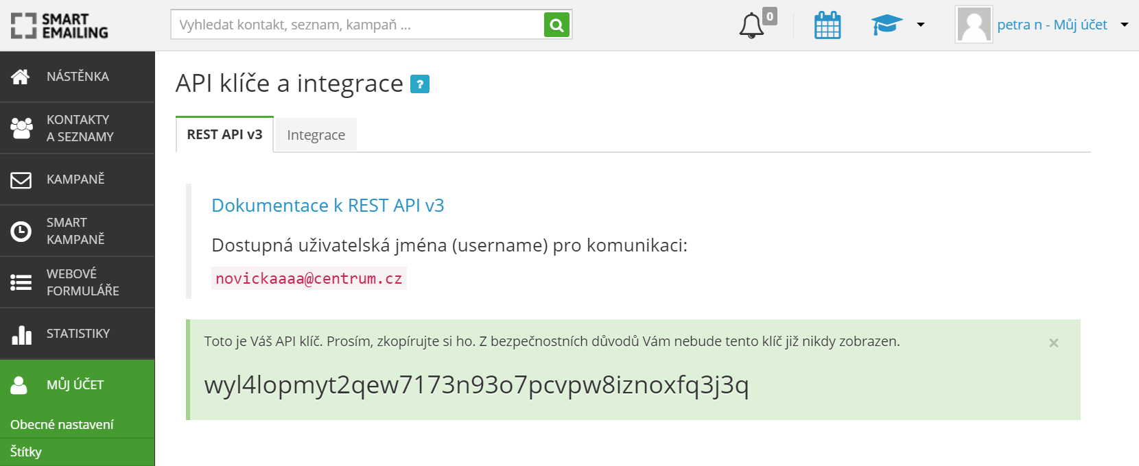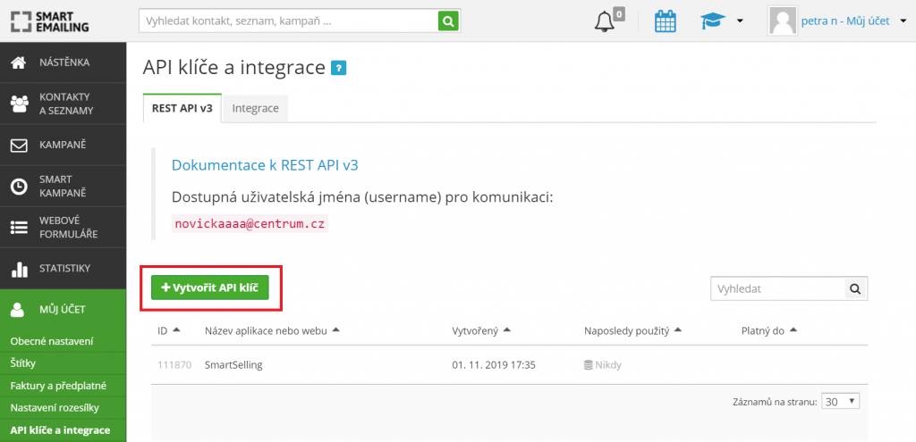 The last piece of information you’ll need can be found in the My Account tab – you’ll find it in the top right corner of your SmartEmailing interface. Select API keys and integrations.