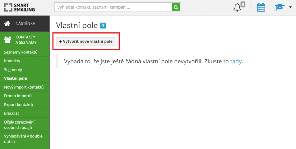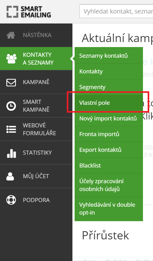 First, open your SmartEmailing and log in. In the left menu, select Contacts and Lists. You will then see another menu. Here, find the Custom Fields item and click on it.